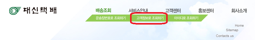 고객정보로 조회하는 방법에 대해 자세하게 설명드리겠습니다. 홈페이지 상단에 배송조회 서비스에서 고객정보로 조회하기를 선택합니다.