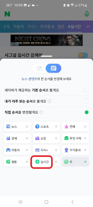 그러면 위 사진과 같이 방금 설정한 이름의 실시간 검색어 순위 서비스가 네이버 홈메뉴 목록에 추가된 것을 확인하실 수 있습니다. 메뉴 순서를 바꾸고 싶으시면 메뉴탭 가장 오른쪽에 있는 양방향 화살표 2획을 클릭하셔서 실시간 순위를 앞쪽으로 배치하거나 변경할 수 있습니다.