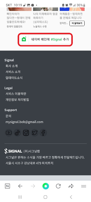 추가로 실시간 검색어를 자주 사용하신다면 홈페이지 아래쪽으로 이동하여 보면 '네이버 메인에 #Signal 추가'라는 버튼이 있습니다