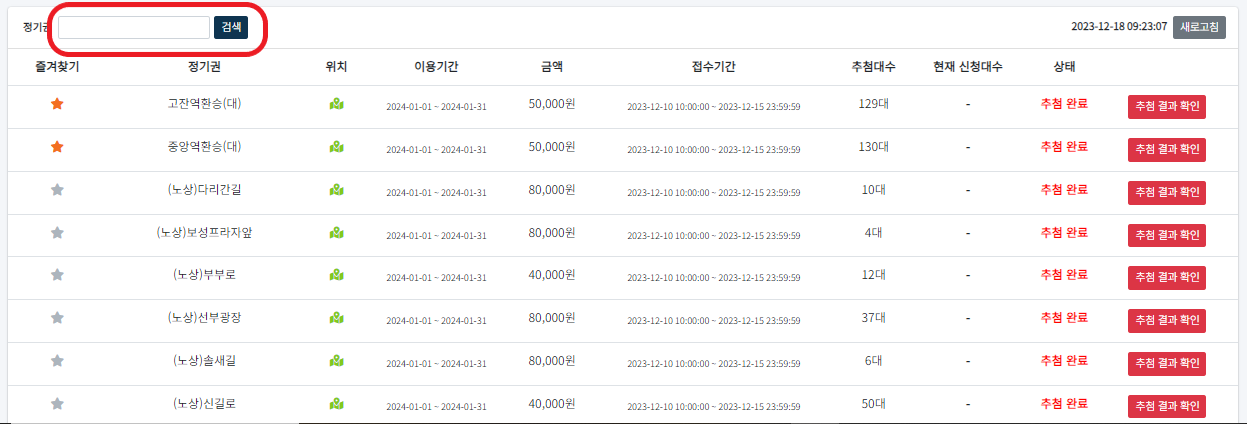 8. 정기권을 이용할 수 있는 주차장 정보가 나열됩니다. 아래 리스트에서 찾아보셔도 되지만 시간단축을 위해 왼쪽 위 검색을 통해 자주 이용하는 역을 검색합니다.
