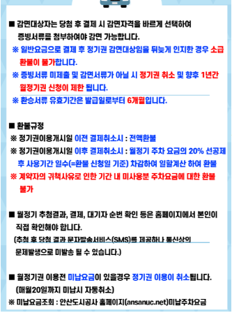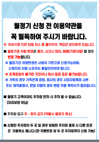 2. 월정기 신청 이용약관입니다. 신청자와 차량 소유주는 동일하여야 하고 가족이 신청시 증빙서류가 필요합니다. 주차료 감면 신청은 추첨이 끝난 후 감면서류를 제출하여 할인을 적용하게 됩니다. 주차장 이용권을 결제하는 것이기에 주차공간에 보장에 대한 것은 아니라는 것을 명심하시면 됩니다.