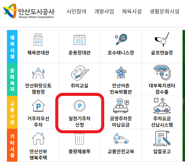 1. 안산시 정기주차신청 페이지 링크를 통해 홈페이지로 접속합니다. 다양한 메뉴들 중에 월정기주차 신청을 찾아 눌러 줍니다. (더블클릭)