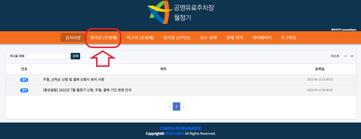 7. 로그인이 완료되면 아래의 화면이 나타나게 되고 상단 메뉴 중 정기권(추첨제)를 찾아 눌러줍니다.(더블클릭)