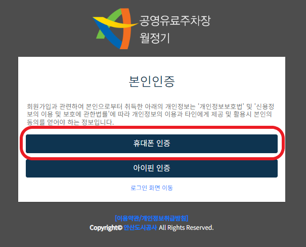 5. 약관 동의 후 본인인증을 먼저 실시한 후 회원가입을 진행하게 됩니다. 휴대폰 인증이나 아이핀 인증을 선택하여 진행하시면 됩니다. 요즘 휴대전화는 모두 가지고 계시기에 휴대폰 인증을 눌러 진행합니다. (더블클릭)
