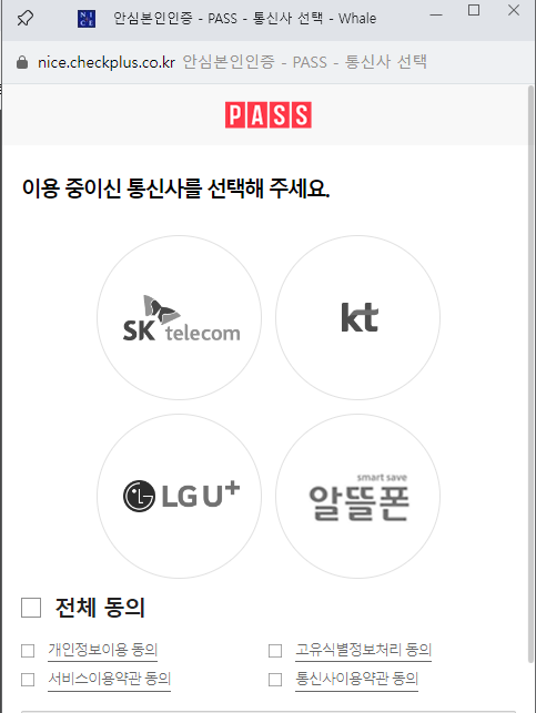 6. 그럼 창이 하나 뜨면서 패스 인증을 하라고 나타납니다. 가입되어 있는 통신사를 선택하고 패스 인증을 진행하시면 회원가입 화면으로 넘어갑니다. 아직 패스 인증서가 없으시다면 아래를 통해 패스 인증서 다운로드 및 사용벙을 확인하신 후에 진행하시면 되겠습니다. 자주 언급드리지만 패스 인증서는 설치해 놓으시면 다양한 곳에서 사용이 됩니다.