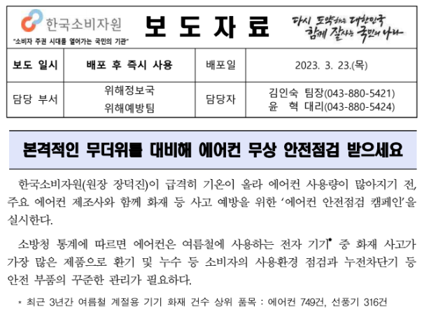 이 사고로 9명이 죽고 49명이 부상을 입었다고 합니다. 이러한 사고를 예방하고자 에어컨 제조사와 한국소비자원에서