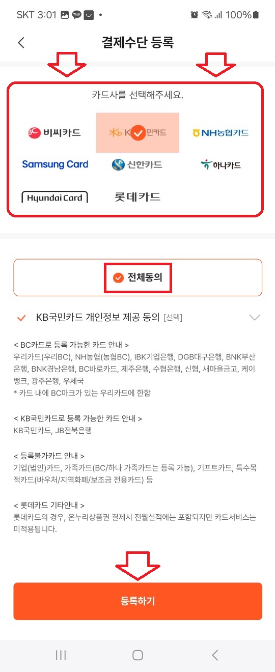 온누리상품권 앱에서 보유 중인 신용카드 또는 체크카드를 등록합니다. 등록 가능한 카드사는 다음과 같습니다: