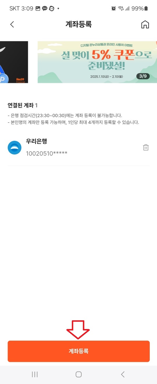 1. 온누리상품권 앱을 실행합니다. 앱의 첫 화면에서 붉은색으로 표시한 계좌 등록을 선택합니다. 저는 등록한 계좌가 있어 보이지만 처음 등록하시는 분들은 아무것도 표시되지 않습니다.
