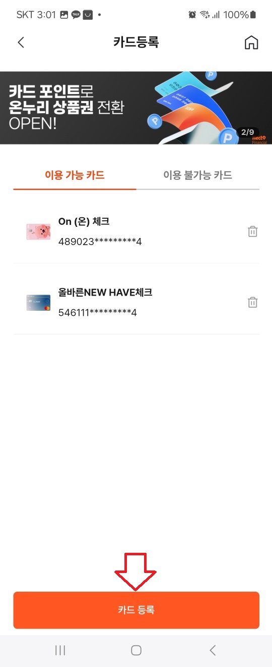 단, 법인카드나 가족카드는 등록이 불가하니 주의하세요.