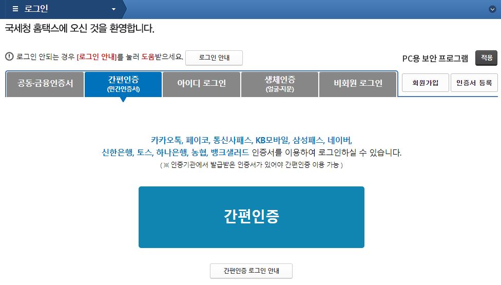 2.여기를 클릭해서 들어가면 나와 관련한 모든 세무 내역이 나옵니다. 로그인 방식을 선택하여 로그인 해줍니다.
