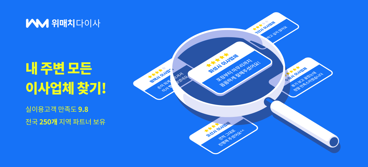 위매치다이사는 전국 3,800개 이상의 이사업체를 비교할 수 있는 대한민국 대표 이사 비교 플랫폼입니다. 간단한 몇 번의 클릭만으로 최대 3곳의 이사업체에서 맞춤형 견적을 받을 수 있습니다.
