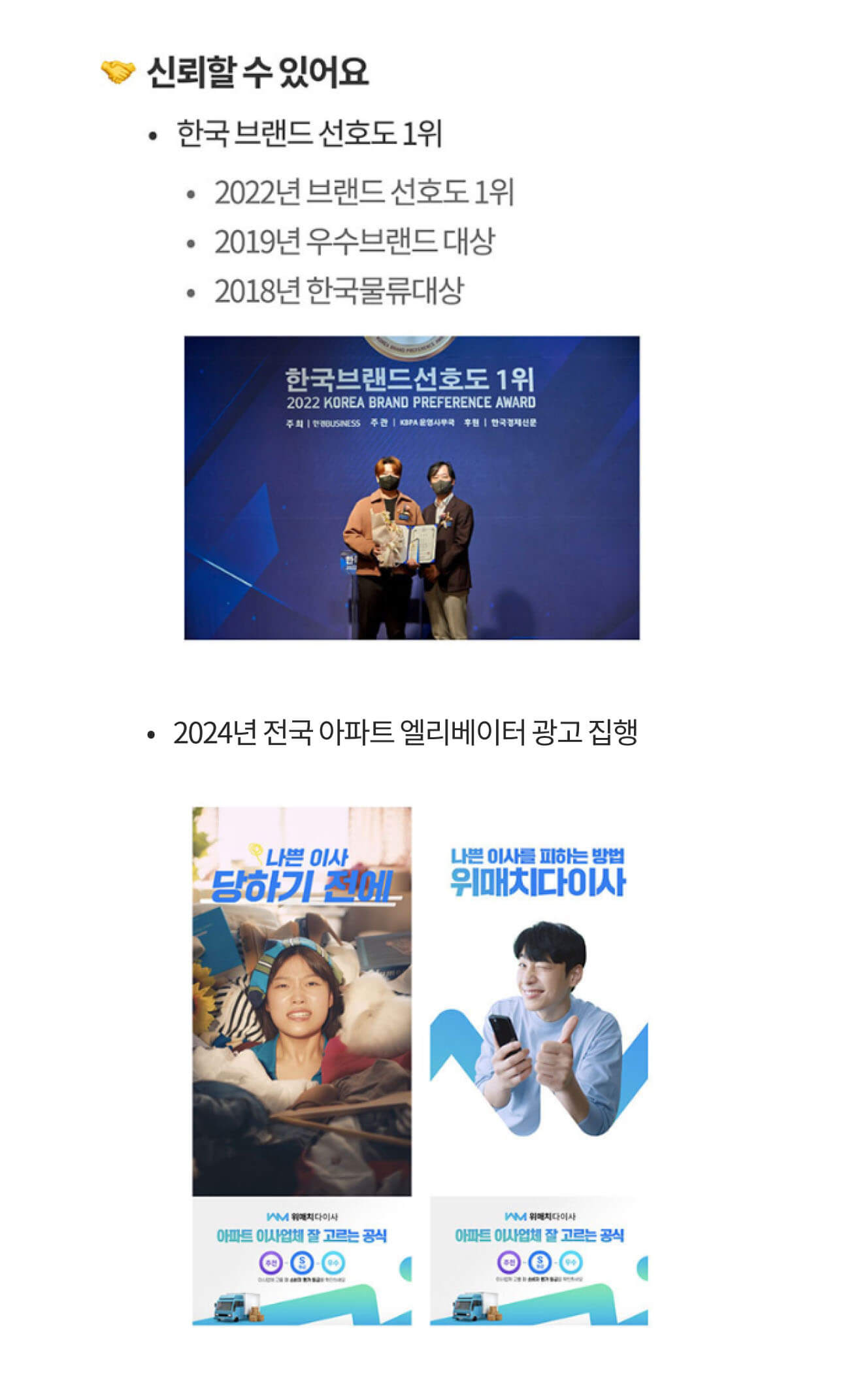 위매치다이사는 이사 비교 서비스 업계에서 가장 높은 인지도를 자랑합니다. 한국 브랜드 선호도 1위라는 타이틀을 보유하고 있으며, 많은 고객들이 이사할 때 가장 먼저 떠올리는 플랫폼입니다. 또한, 아파트 엘리베이터 광고 등 다양한 경로를 통해 브랜드 인지도를 높이며, 고객들의 신뢰를 얻고 있습니다.