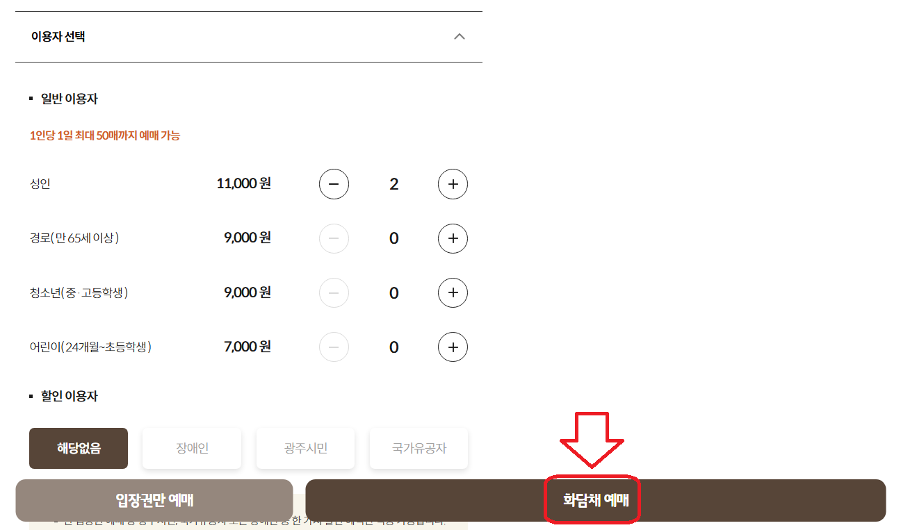 3. 방문 날짜와 시간, 티켓 종류 선택 : 성인, 청소년, 어린이 등 사용자 카테고리를 선택하고 수량을 조정합니다.