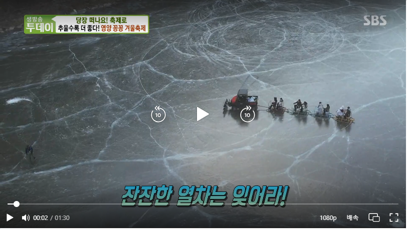 이번 코너에서는 경상북도 영양군에서 열리는 '영양 꽁꽁 겨울축제'가 소개되었습니다. 이 축제는 현리 빙상장 일원에서 진행되며, 겨울철 얼음 위에서 즐길 수 있는 다양한 체험과 이벤트를 제공합니다. 추운 날씨 속에서도 따뜻한 추억을 만들 수 있는 이 축제는 가족 단위 방문객들에게 특히 추천됩니다.